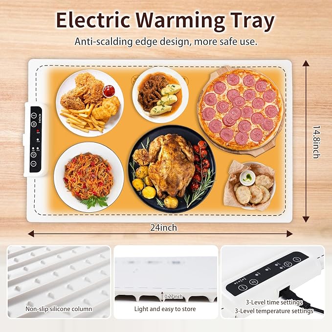 • Convenient Function:automatic timing function, 3-level temperature setting,the warming tray can meet your daily various functional needs, heating dishes, thawing steak, fermented dough and more.